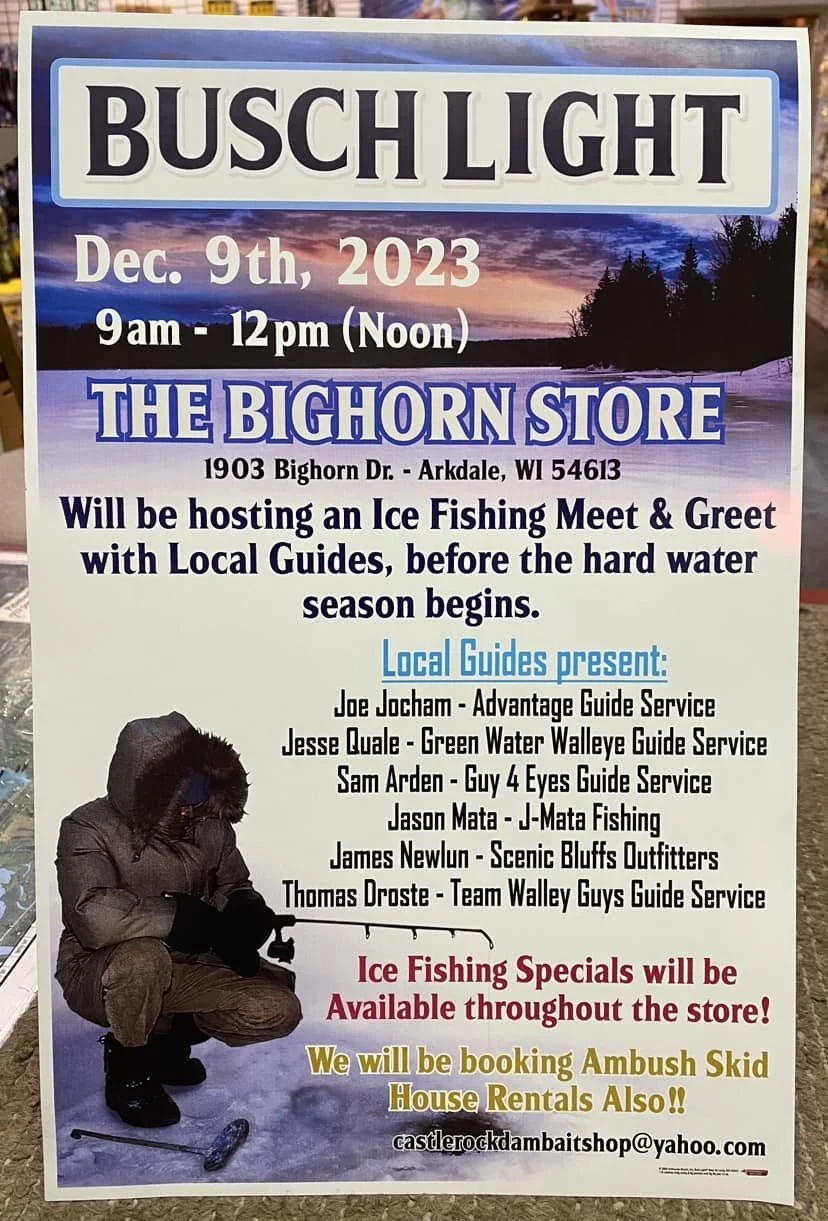 Ice Fishing Meet & Greet Saturday, December 9, 2023 9:00 AM 12:00 PM The Big Horn Store 1903 Bighorn Drive Arkdale, WI, 54613 United States (map) Google Calendar ICS