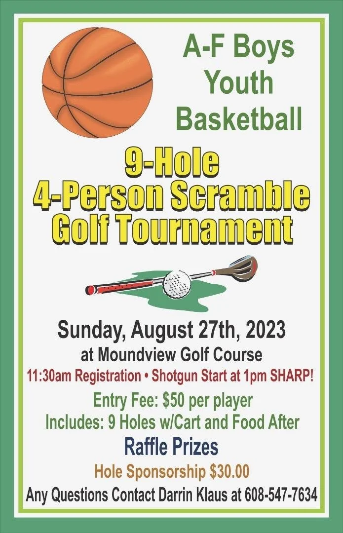 A-F Boys Youth Basketball Golf Scramble Sunday, August 27, 2023 11:30 AM 4:30 PM Moundview Golf Course (map) Google Calendar ICS