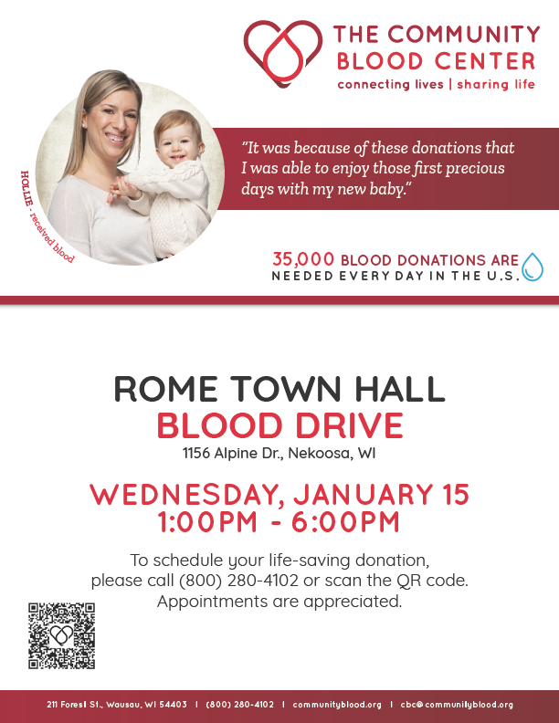 Blood Drive Wednesday, January 15, 2025 1:00 PM 6:00 PM Rome Town Hall 1156 Alpine Drive Nekoosa, WI, 54457 United States (map) Google Calendar ICS
