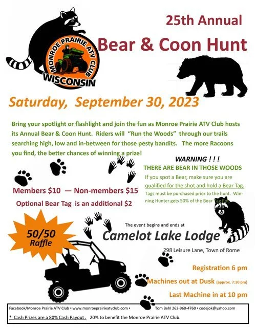 25th Annual Bear & Coon Hunt Saturday, September 30, 2023 6:00 PM 10:10 PM Camelot on the Lake 298 Leisure Lane Nekoosa, WI, 54457 United States (map) Google Calendar ICS