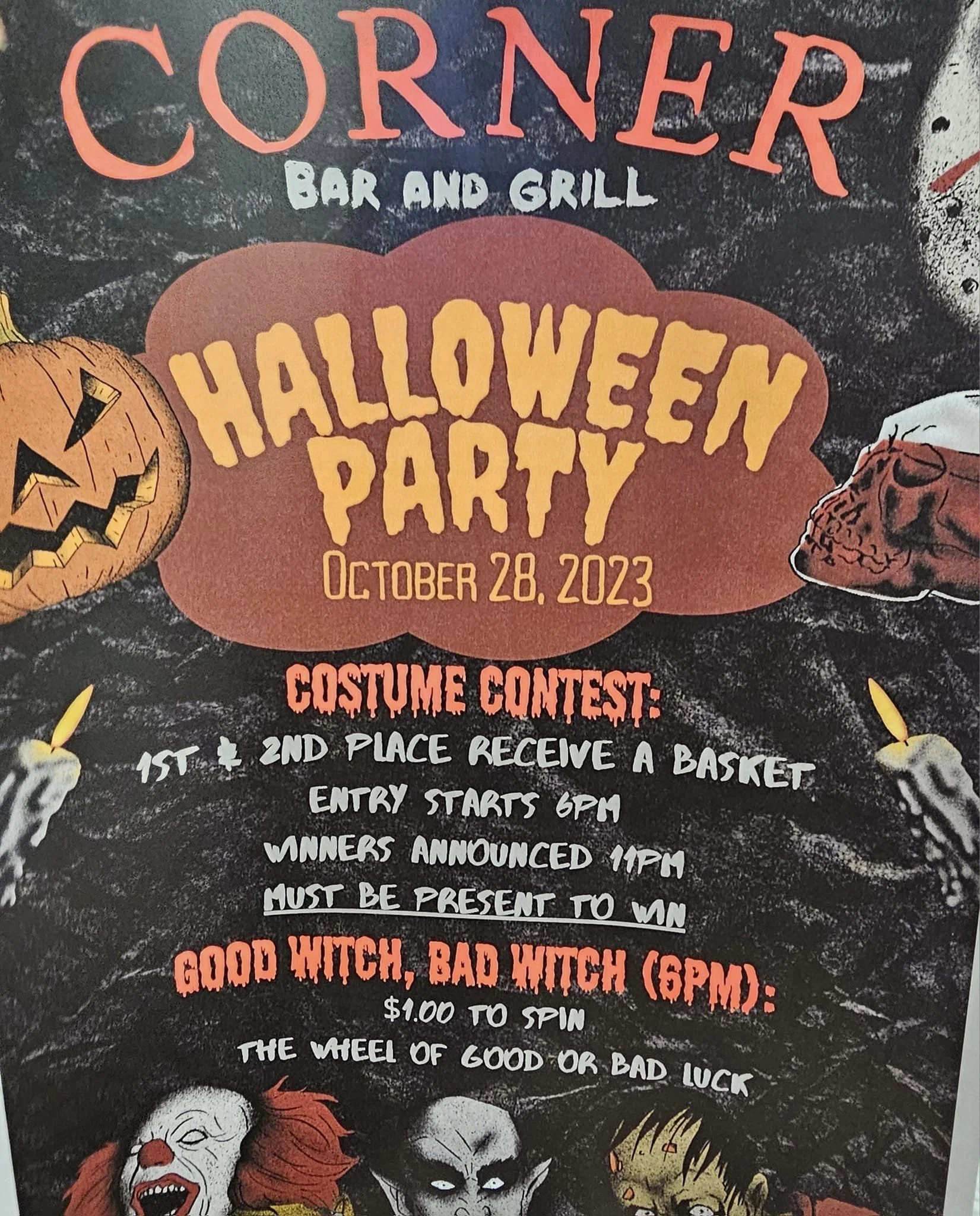 Back to All Events Halloween Party Saturday, October 28, 2023 6:00 PM 11:55 PM Corner Bar 300 Main Street Friendship, WI, 53934 United States (map) Google Calendar ICS