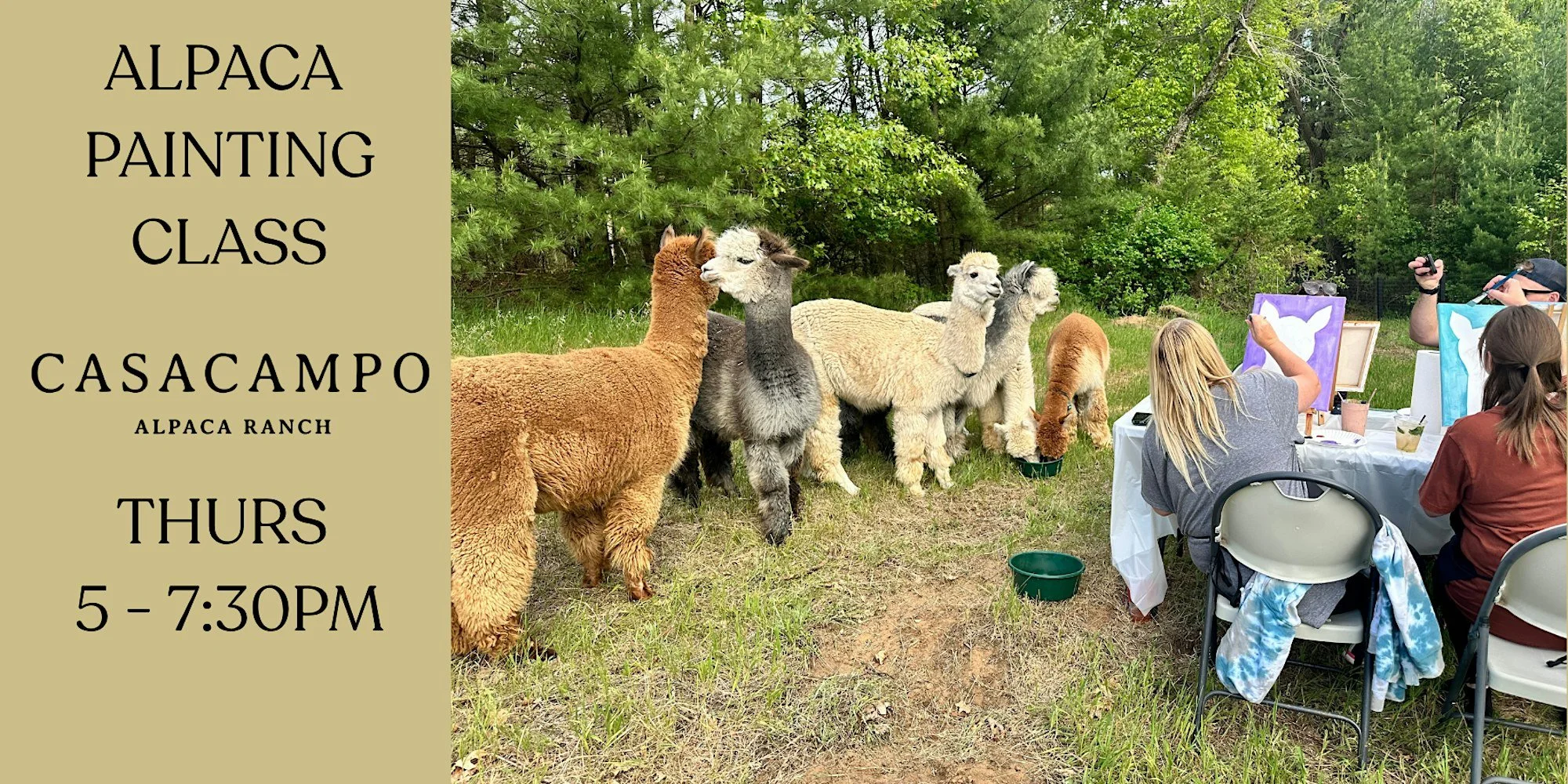 Join us at CASACAMPO ALPACA RANCH for an evening of fun and creativity! Our summer series, painting with the alpacas will be every other Thursday evening. Your experience starts by checking it at the cellar and either walking up or catching a ride up to the pasture. Tables will be set up outdoors for an authentic experience. Treats will be provided so each person can interact with the animals while the paint.