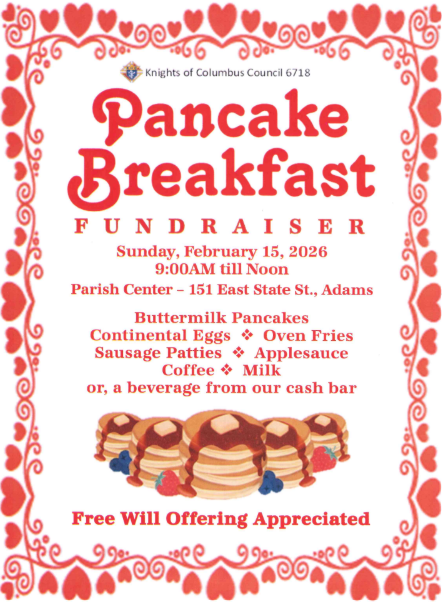 Pancake Breakfast Sunday, February 15, 2026 9:00 AM 12:00 PM Parish Center 151 East State Street Adams, WI, 53910 United States (map) Google Calendar ICS