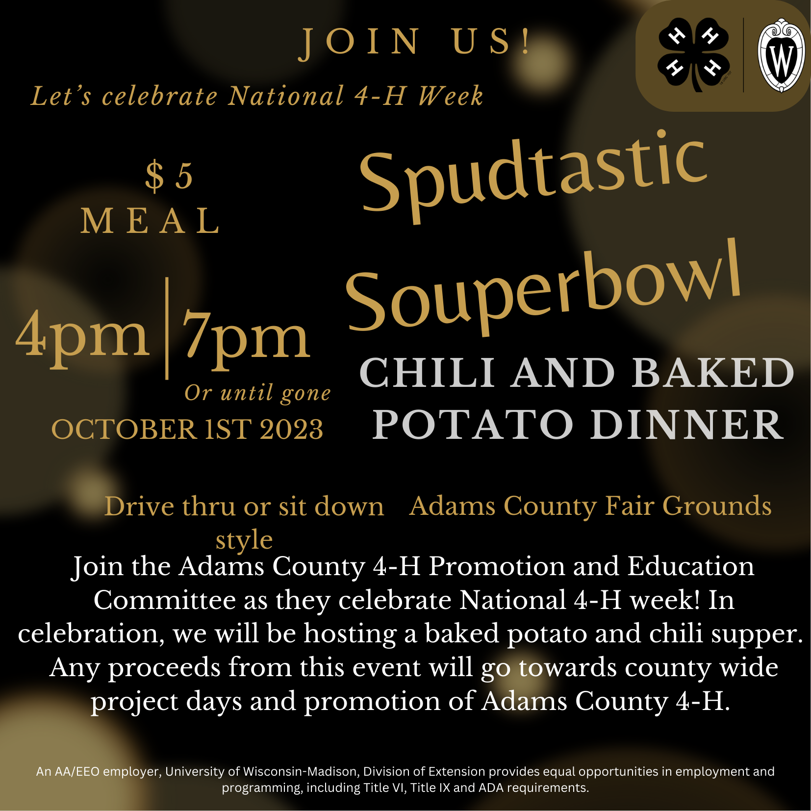 Join the Adams County 4-H Promotion and Education Committee as they celebrate National 4-H week! In celebration, they will be hosting a baked potato and chili supper. Any proceeds from this event will go towards county-wide project days and promotion of Adams County 4-H.