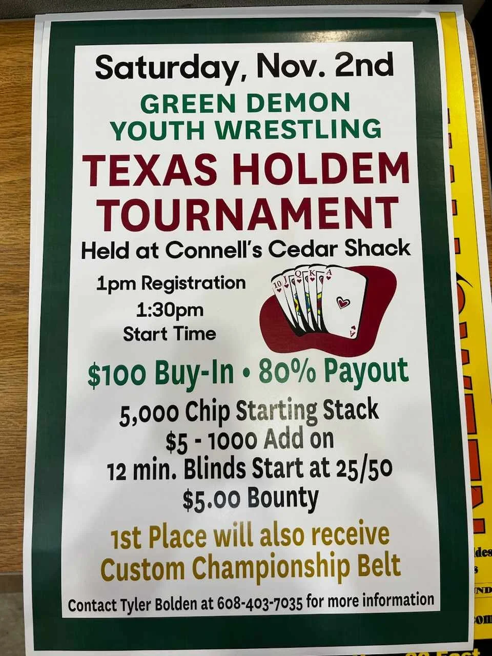 Back to All Events Texas Holdem Tournament Saturday, November 2, 2024 1:00 PM 4:40 PM Connell's Cedar Shack 2248 State Hwy 13, Adams, WI 53910 (map) Google Calendar ICS