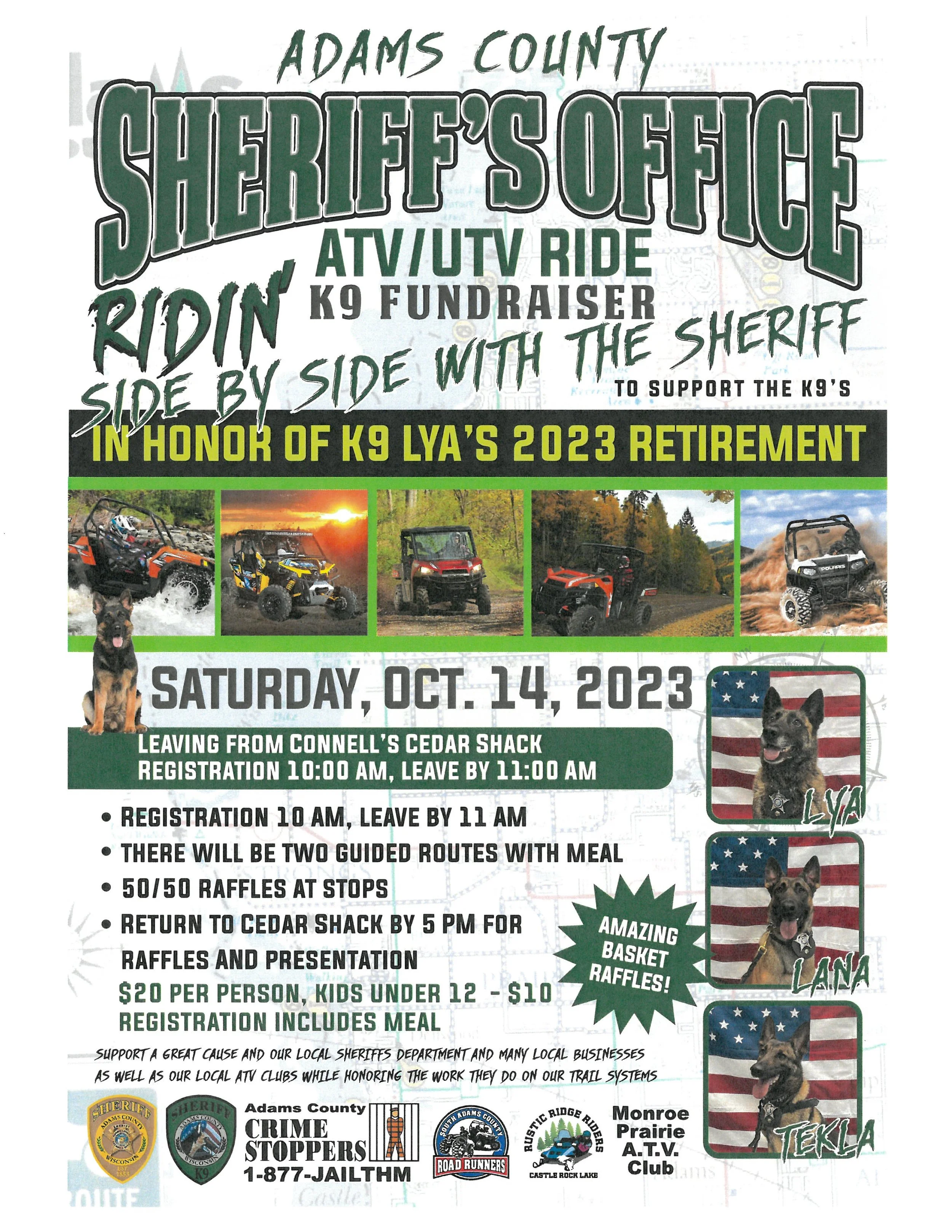 Ridin’ Side by Side with the Sheriff - Adams County Sheriff K9 Fundraiser ATV/UTV Ride Saturday, October 14, 2023 10:00 AM 7:00 PM Connell's Cedar Shack 2248 State Highway 13 Adams, WI, 53910 United States (map) Google Calendar ICS